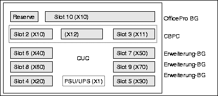 Rückwandverdrahtung (Backplane) der OfficePoint (Connection Unit Point - CUP), Steckerbezeichnung und Slotbelegung